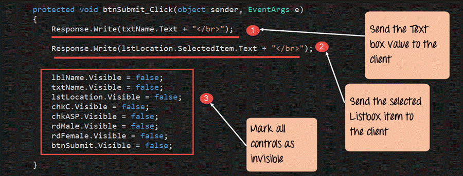 - 下一行代码通过“lstLocation.SelectedItem.text”属性获取列表框的选定值。然后,它通过 Response.Write 方法将该值写回客户端。