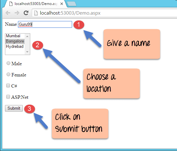 - 上面的代码行执行最简单的操作。它获取 Name 文本框控件的值,并通过 Response 对象将其发送到客户端。因此,如果您想在 name 文本框中输入字符串“Guru99”,则 txtName 的值。文本将是“Guru99”。