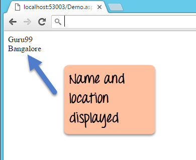 完成此操作后,您将在页面上看到“Guru99”和位置“Bangalore”。