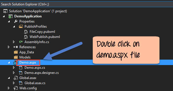 步骤 1) 让我们处理我们的 DemoApplication。从解决方案资源管理器打开 demo.aspx 文件。