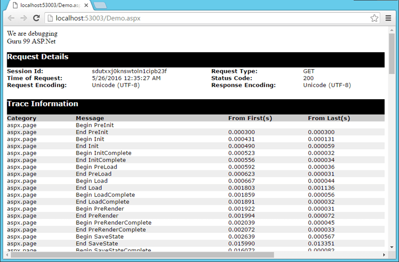 现在,当显示 Demo.aspx 网页时,您将获得有关该页面的大量信息。例如,页面生命周期各个方面的时间将在此页面上显示。