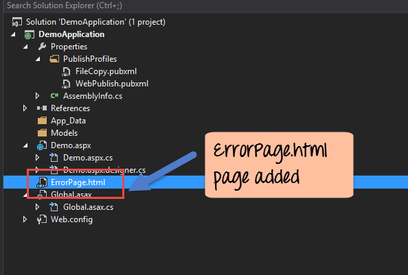 步骤 3) Errorpage 将在 Visual Studio 中自动打开。如果您转到解决方案资源管理器,您将看到已添加的文件。