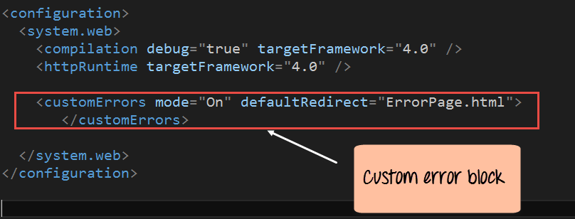 <configuration> <system.web> <compilation debug="true" targetFramework="4.0" /> <httpRuntime targetFramework="4.0” /> <customErrors mode="On" defaultRedirect="ErrorPage.html"> </customErrors> </system.web> </configuration>