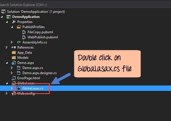 步骤 1) 让我们处理我们的 DemoApplication。从解决方案资源管理器打开 Global.asax.cs 文件。