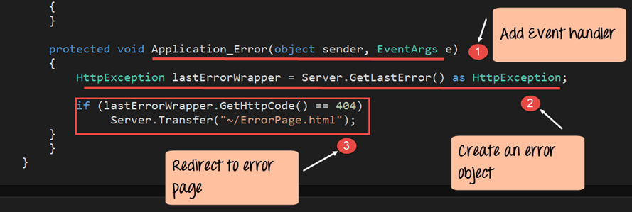 - 第一行是 Application_Error 事件处理程序。每当应用程序中发生错误时,都会调用此事件。请注意,事件名称必须是“Application_Error”。并且参数应如上所示。