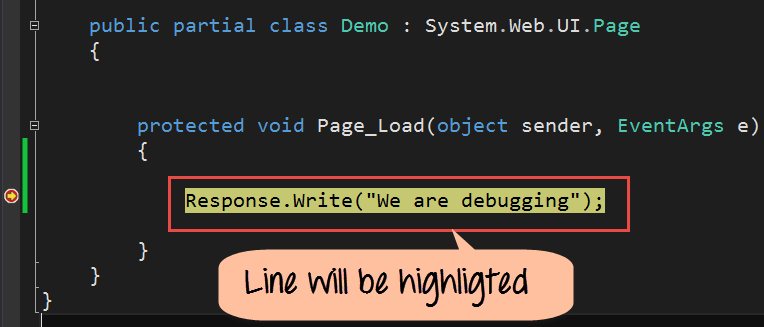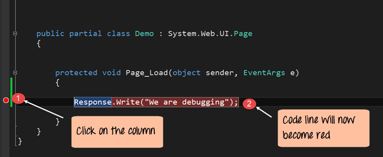 - 要添加断点,您需要单击要插入断点的列。所以,在我们的例子中,我们希望程序在 Response.Write 代码行处停止。您无需添加任何命令即可添加断点。您只需单击要添加断点的行。