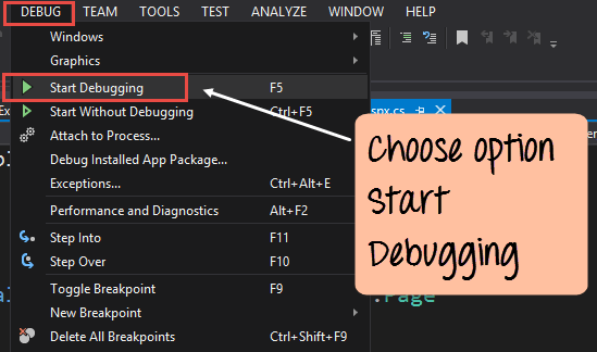 现在您需要使用调试模式运行应用程序。在 Visual Studio 中,选择菜单选项 Debug->Start Debugging。