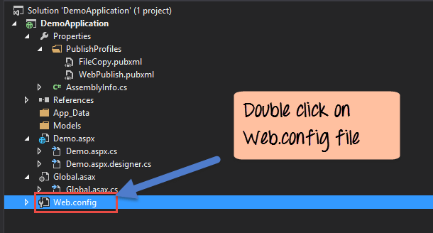 步骤 1) 让我们处理我们的“DemoApplication”。从解决方案资源管理器打开 web.config 文件。