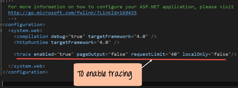 <?xml version="1.0" encoding="utf-8"?> <! -- For more information on how to configure your ASP.NET application, please visit http://go.microsoft.com/fwlink/?LinkId=169433 --> <configuration> <system.web> <compilation debug="true" targetFramework="4.0" /> <httpRuntime targetFramework="4.0” /> <trace enable="true" pageOutput="false" requestLimit="40" localOnly="false"/> </system.web> </configuration>