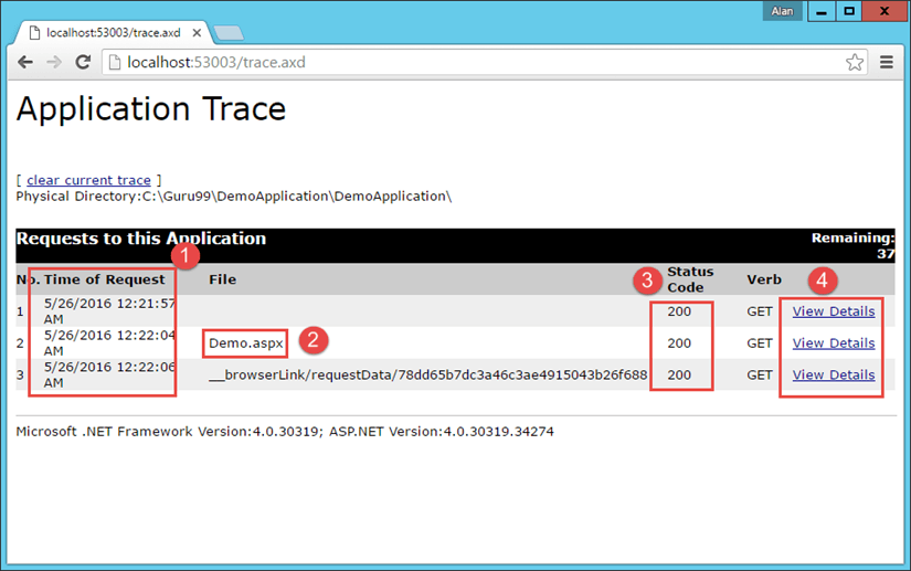 如果您现在浏览到 URL – https://:53003/trace.axd ,您将看到每个请求的信息。在这里,您可以查看应用程序中是否发生任何错误。上述页面显示以下类型的信息: