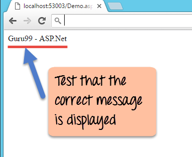 让我们看下面的网页。在页面上,我们显示了消息“Guru99 – ASP.Net”。现在我们如何确认在 ASP.Net 项目运行时显示了正确的消息。这是通过向 ASP.Net 解决方案(用于开发基于 Web 的应用程序)添加测试项目来完成的。此测试项目将确保向用户显示正确的消息。