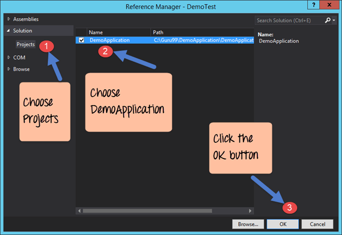 第 1 步) 要测试我们的 Demo 应用程序,首先需要测试项目引用 Demo 应用程序。将引用添加到 Demo.aspx 解决方案。