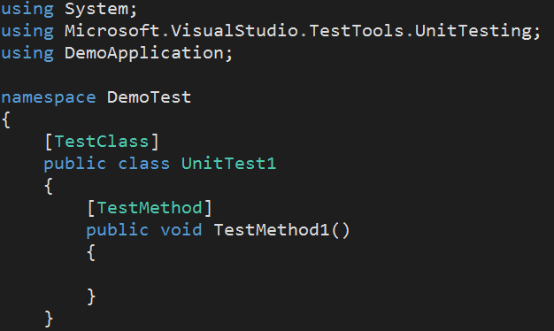 你将在 UnitTest1.cs 文件中看到 Visual Studio 添加的以下代码。这是测试项目运行所需的基本代码。