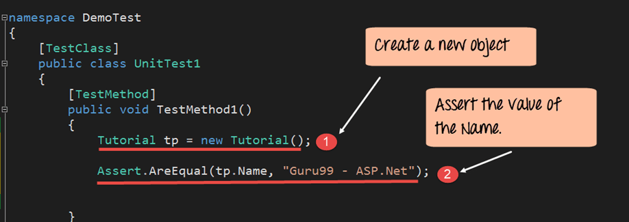 - Assert.AreEqual 方法用于 .Net 以测试一个值是否等于某个值。因此,在本例中,我们将 tp.Name 的值与 Guru99 – ASP.Net 进行比较。
