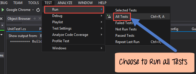 第 5 步) 现在让我们运行我们的测试项目。为此,我们需要转到菜单选项“测试”->“运行”->“所有测试”。