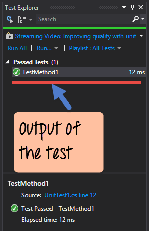 测试资源管理器窗口将出现在 Visual Studio 中。它将显示上述结果,并显示 Visual Studio 中成功运行了测试。