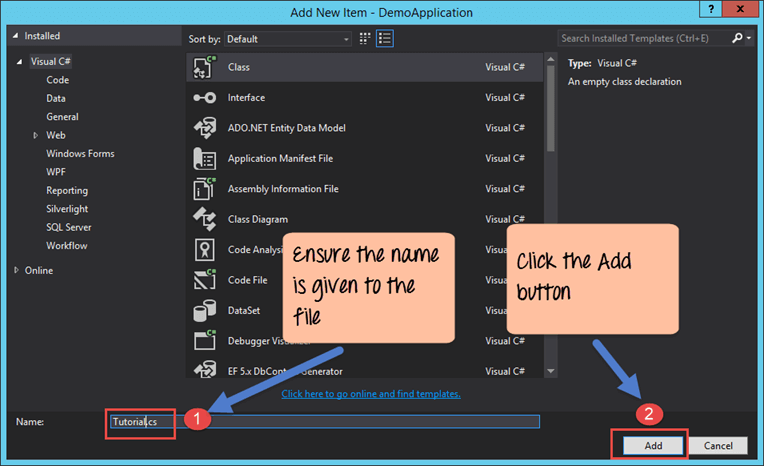 第 2 步) 现在让我们向 DemoApplication 添加一个新类。该类将包含一个名为“Guru99 – ASP.Net.” 的字符串。此字符串将在我们的测试项目中进行测试。