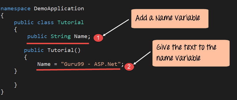 - 最后,在 Tutorial 类的构造函数中,将 Name 变量的值赋给“Guru99 – ASP.Net”。