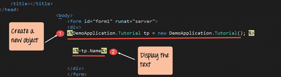 <!DOCTYPE html> <html xmlns="http://www.w3.ore/1999/xhtml"> <head runat="server"> <title></title> </head> <body> <form id="form1" runat="server”> <div> <% DemoApplication.Tutorial tp=new DemoApplication.Tutorial();%> <%=tp.Name%> </div> </form> </body> </html>