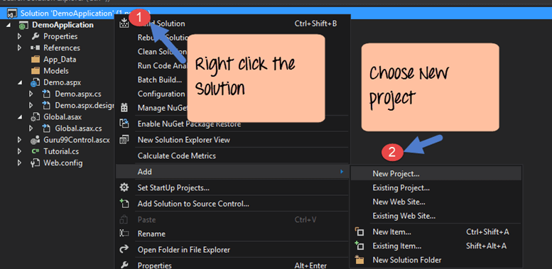 - 我们将向 DemoApplication 添加一个新类。该类将包含一个名为“Guru99 – ASP.Net.” 的字符串。此字符串将在我们的测试项目中进行测试。