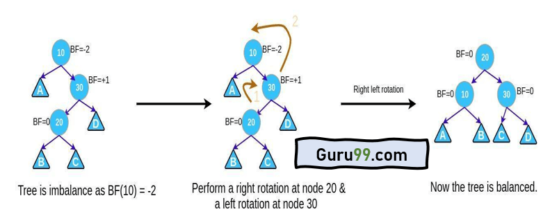 - 2B。如果BF(节点) = -2 且 BF(节点 -> 右孩子) = +1,执行RL旋转。
