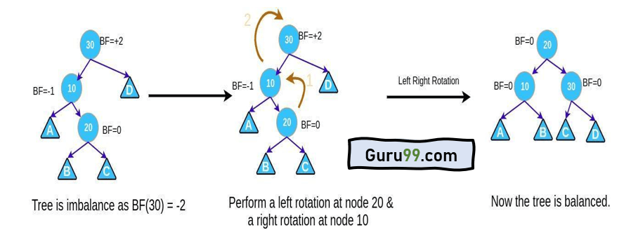 - 如果BF(节点) = +2 且 BF(节点 -> 左孩子) = -1,执行LR旋转。