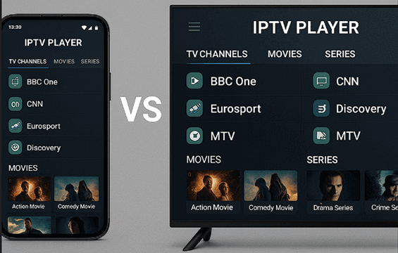 | 安卓电视的 IPTV 应用专为大屏幕设计,支持遥控导航/语音搜索。 | 而智能手机的 IPTV 应用则专为较小的触摸屏显示器设计。 |