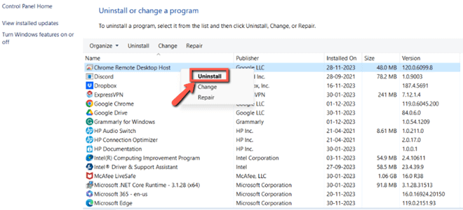 步骤2)选择“程序”>“程序和功能”,找到目标应用程序,右键单击并选择“卸载”。