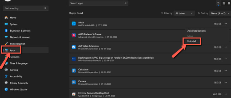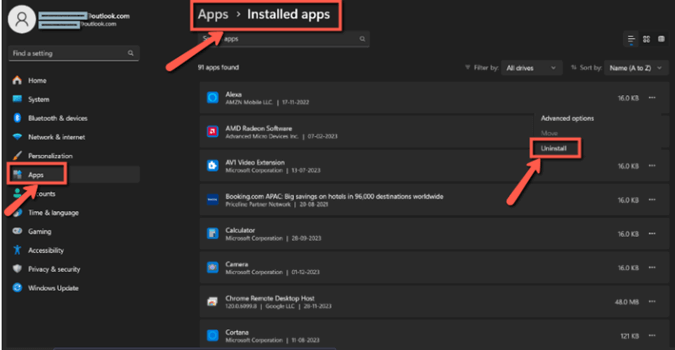步骤2)现在,点击“应用”>“已安装的应用”,找到您想要卸载的应用程序,点击它,然后选择“卸载”。