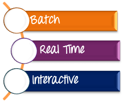 - 大数据处理可以是批处理、实时处理或交互式处理。
