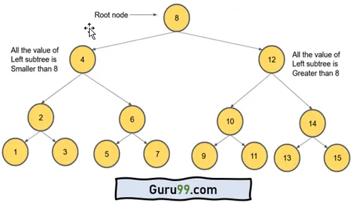 在这里,您可以看到所有节点都遵循给定的规则。二叉搜索树中最大节点数有一个公式。如果我们观察上面的树,我们可以看到除了所有叶节点之外,每个节点都有两个子节点。并且给定二叉树的高度 (h) 为 4。公式是 **2h – 1**。所以,结果是 15。