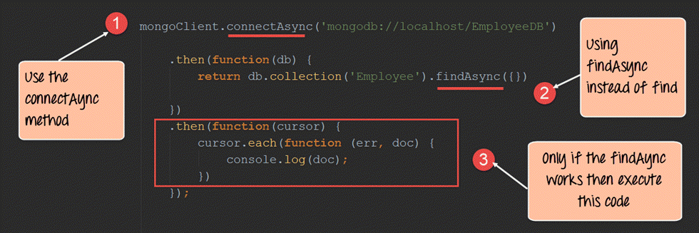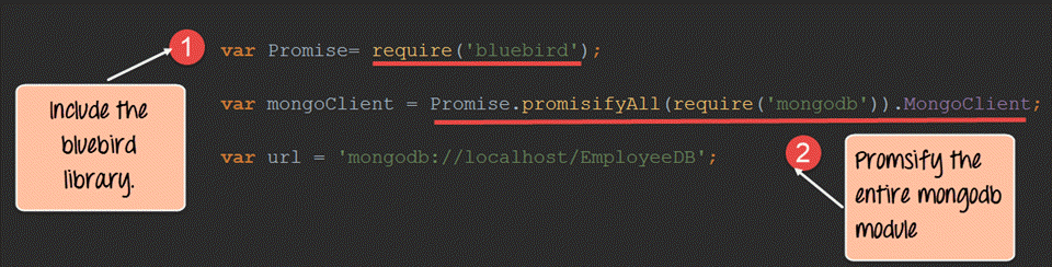 - 使用 Bluebird 的 .promisifyAll() 方法为 MongoDB 模块提供的每个方法创建一个异步版本。这确保了 MongoDB 模块的每个方法都将在后台运行,并确保 MongoDB 库中的每个方法调用都返回一个 Promise。