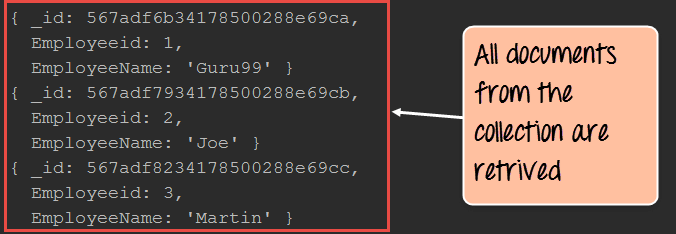 如果正确执行上述步骤,Employee 集合中的所有文档将显示在控制台中,如下面的输出所示。