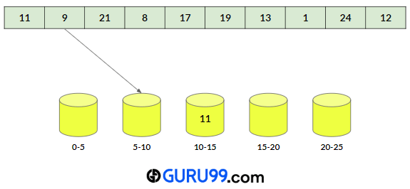 步骤 2) 对于每个数组元素,我们将计算桶索引并将元素放入该桶中。