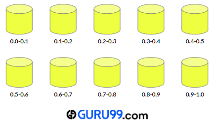 步骤 1) 首先,我们将创建 10 个空桶。第一个桶将包含 0.0 到 0.1 之间的数字。然后第二个桶将包含 0.1 到 0.2 之间的数字,依此类推。