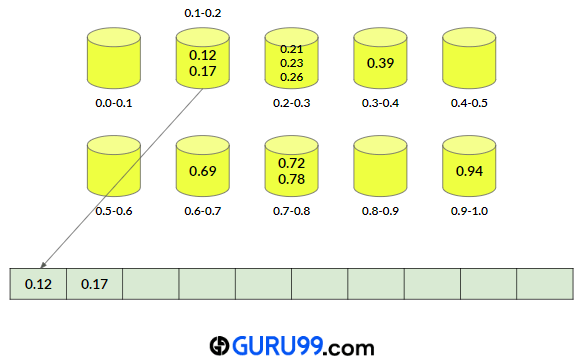 步骤 1) 创建十(10)个空桶,第一个桶将包含范围 [0.0, 0.1) 内的数字。然后第二个桶将包含范围 [0.1, 0.2) 内的数字,依此类推。