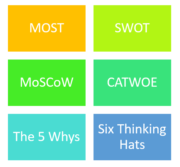 - 重要的业务分析技术包括:1) MOST 2) PESTLE 3) SWOT 4) MoSCoW 5) CATWOE 6) 五个为什么和 7) 六顶思考帽。
