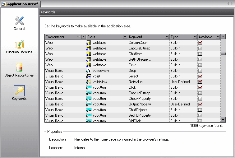 关键字窗格显示所有内置方法、函数库中的所有用户定义函数以及对象存储库中的对象。此外,关键字窗格还显示我们开发或第三方使用插件可扩展性开发的任何测试对象类的方法和属性。