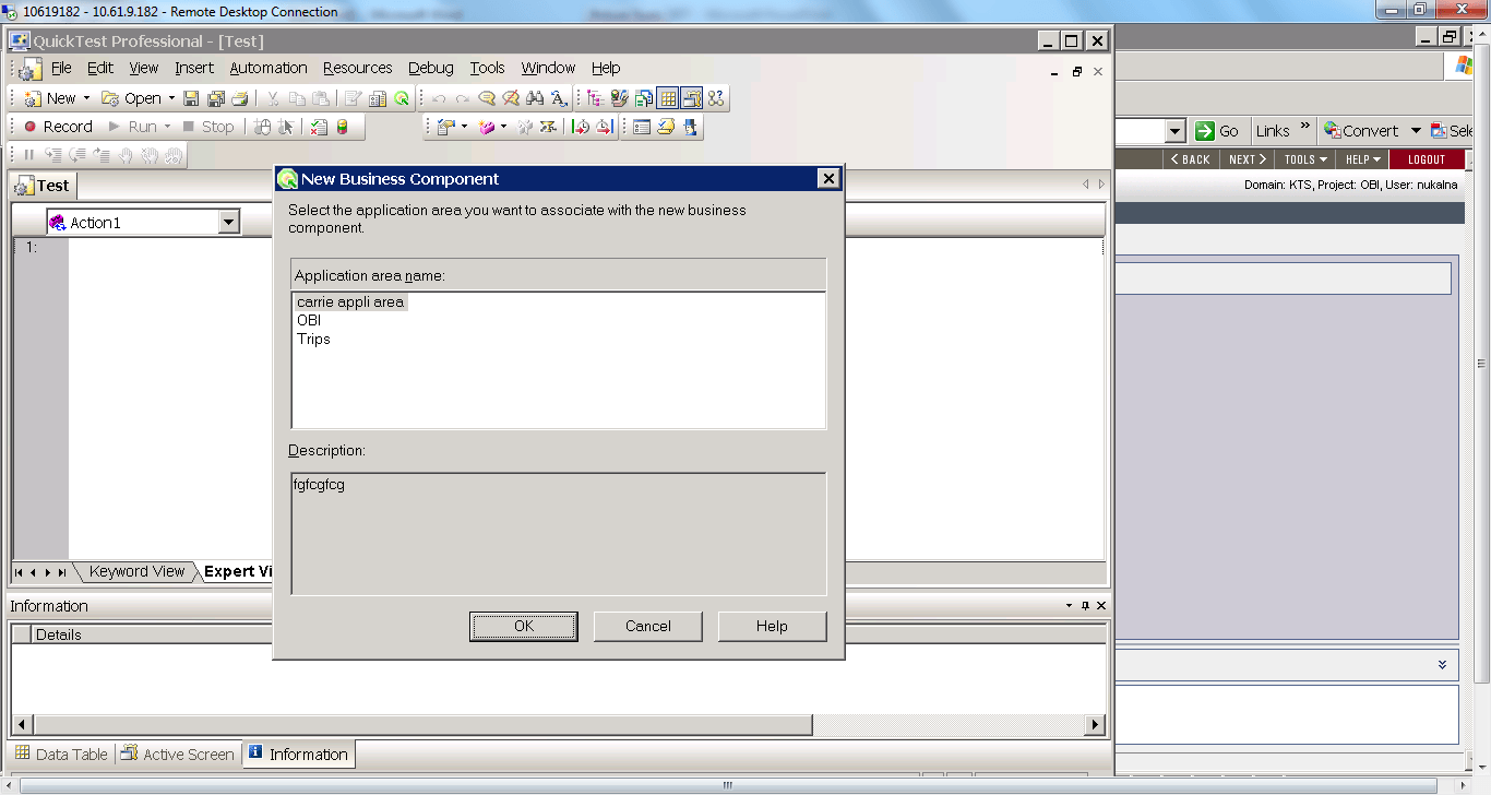 点击“启动”按钮(QTP 应该安装在同一台机器上),它将打开 QTP 并显示一个弹出窗口,要求我们将一个应用程序区域与组件关联。