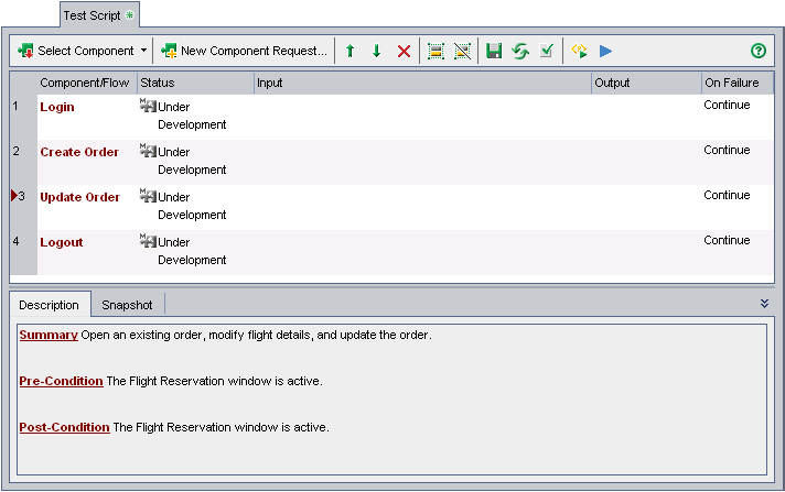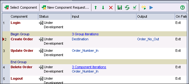 组件在测试脚本编辑器窗格中排列后,将显示为五列结构