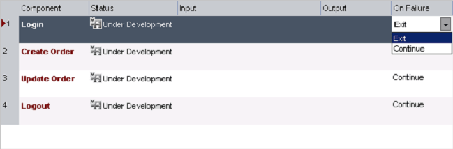 失败时:将显示一个下拉菜单,您可以在其中选择当组件失败时您希望如何处理 BPT 执行。您可以选择继续或退出 BPT。