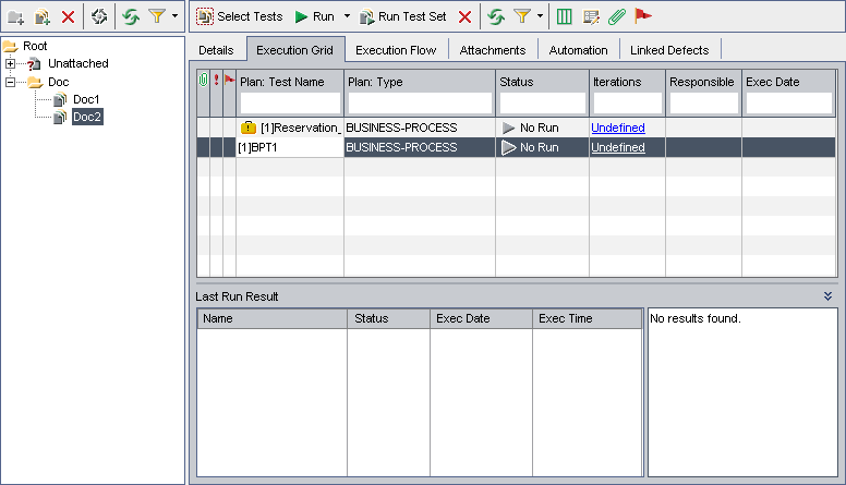 从“测试实验室网格”中选择“选择测试”选项,右侧将显示一个测试计划树结构窗格,其中包含所有测试用例。选择您要运行的 BPT,然后点击箭头按钮,BPT 将被添加到“执行网格”。您也可以使用拖放功能来选择要运行的 BPT。