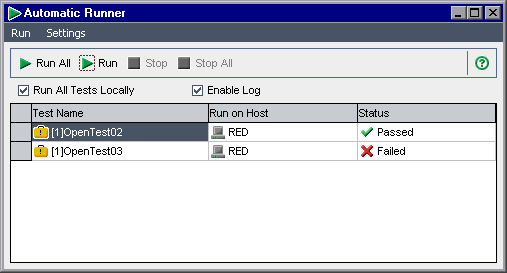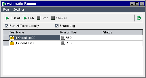 在“主机上运行”列中填写机器名称后,如果您想运行“自动运行器”窗口中的所有测试,需要点击“运行所有”;如果您只想运行选定的 BPT,则点击“运行”。