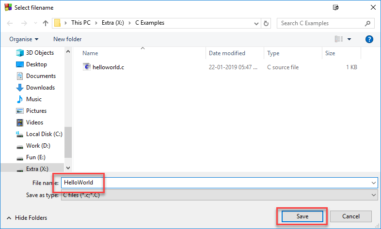 步骤 6) 选择新 C 文件的路径,然后选择其名称(带有 .c 扩展名)并保存。