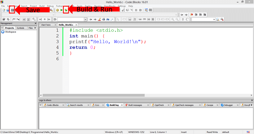 步骤 8) 输入代码,保存它,然后单击“构建和运行”按钮进行编译。