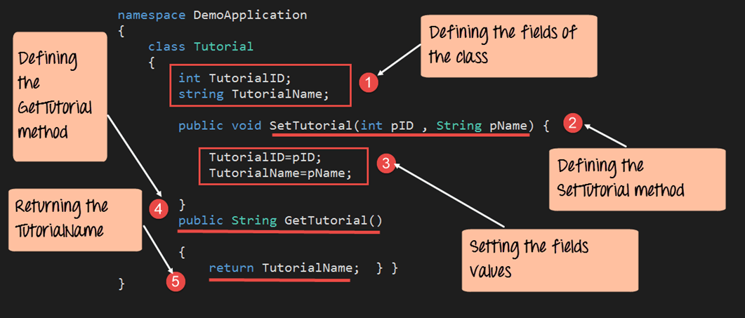 - SetTutorial – 此方法将用于设置教程的 ID 和名称。例如,如果我们想创建一个 .Net 教程,我们可以为此创建一个对象。该对象将有一个 ID,例如 1。其次,我们将为教程名称分配“.Net”。ID 值 1 和名称“.Net”将作为对象属性存储。