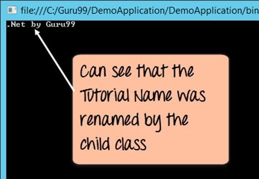 - 然后我们调用 GetTutorial 方法。请注意,即使此方法未在 Guru99Tutorial 类中定义,我们仍然可以访问此方法。GetTutorial 方法的输出随后通过 Console.WriteLine 方法显示到控制台。