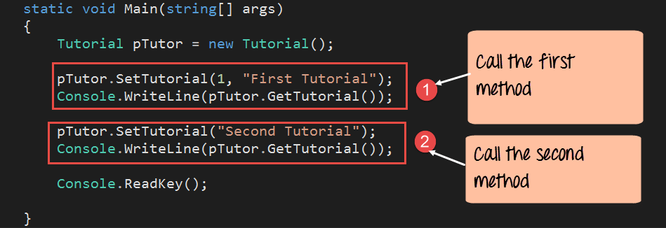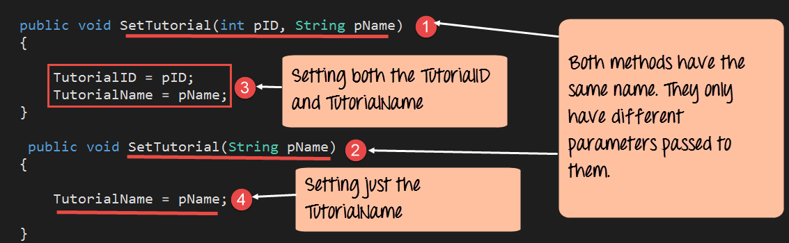 4) 在这里,我们更改了我们的类,在该类中我们添加了一个与 SetTutorial 同名的新方法。这次我们只传递一个参数,即 pName。在此方法中,我们只是将 TutorialName 字段设置为 pName。