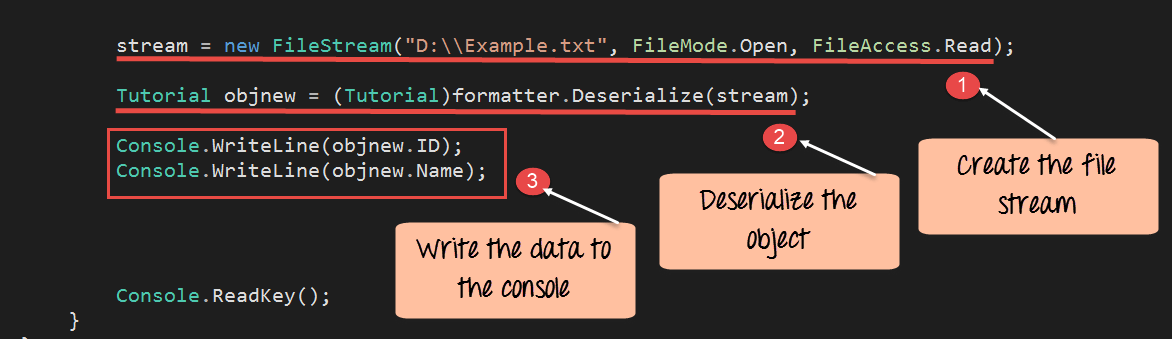 - 最后,我们将使用反序列化从文件中反序列化该对象,并在控制台中显示这些值。