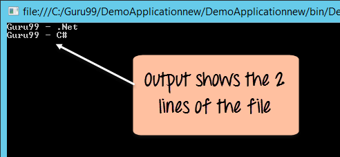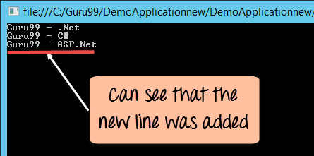 从输出中,您可以看到行“Guru99 – ASP.Net”已成功添加到文件中。控制台中可以看到所有 3 行文本。